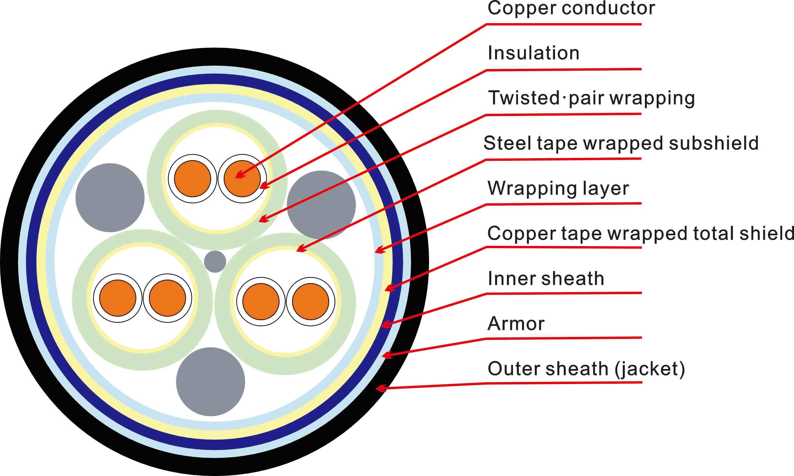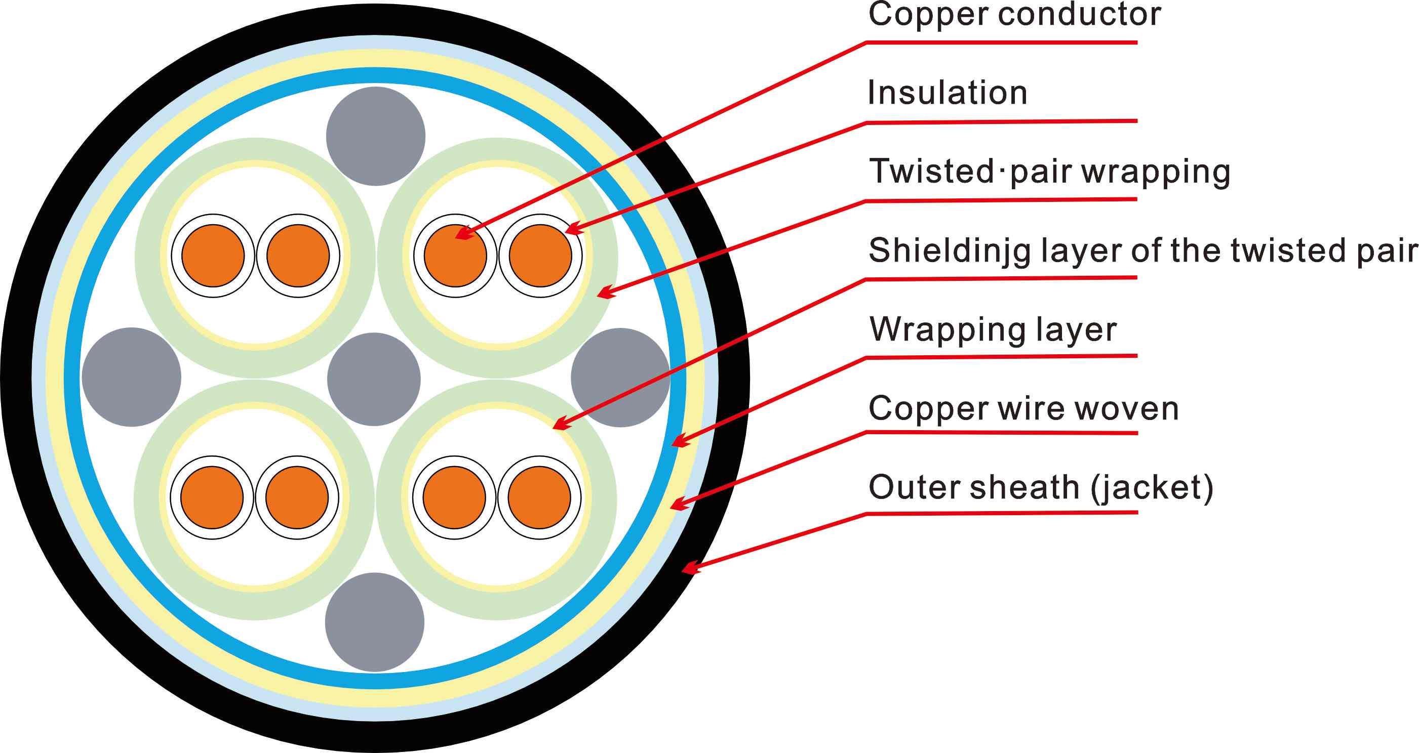 العزل: البولي إيثيلين/البولي إيثيلين المتشابك لتقليل فقد العزل الكهربائي؛ البولي فينيل كلوريد/الإيثيلين بروبيلين بارافورمالدهيد اختياري
